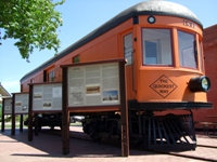 Interurban Express Motor #330 Rail Car returned to Old Town in March 2010. The 18,000-pound circa 1902 refurbished trolley car was placed on the trucks (2 swiveling wheel sets that weigh a combined total of 5 tons) that were installed on the pad next to the Burleson Visitors Center.