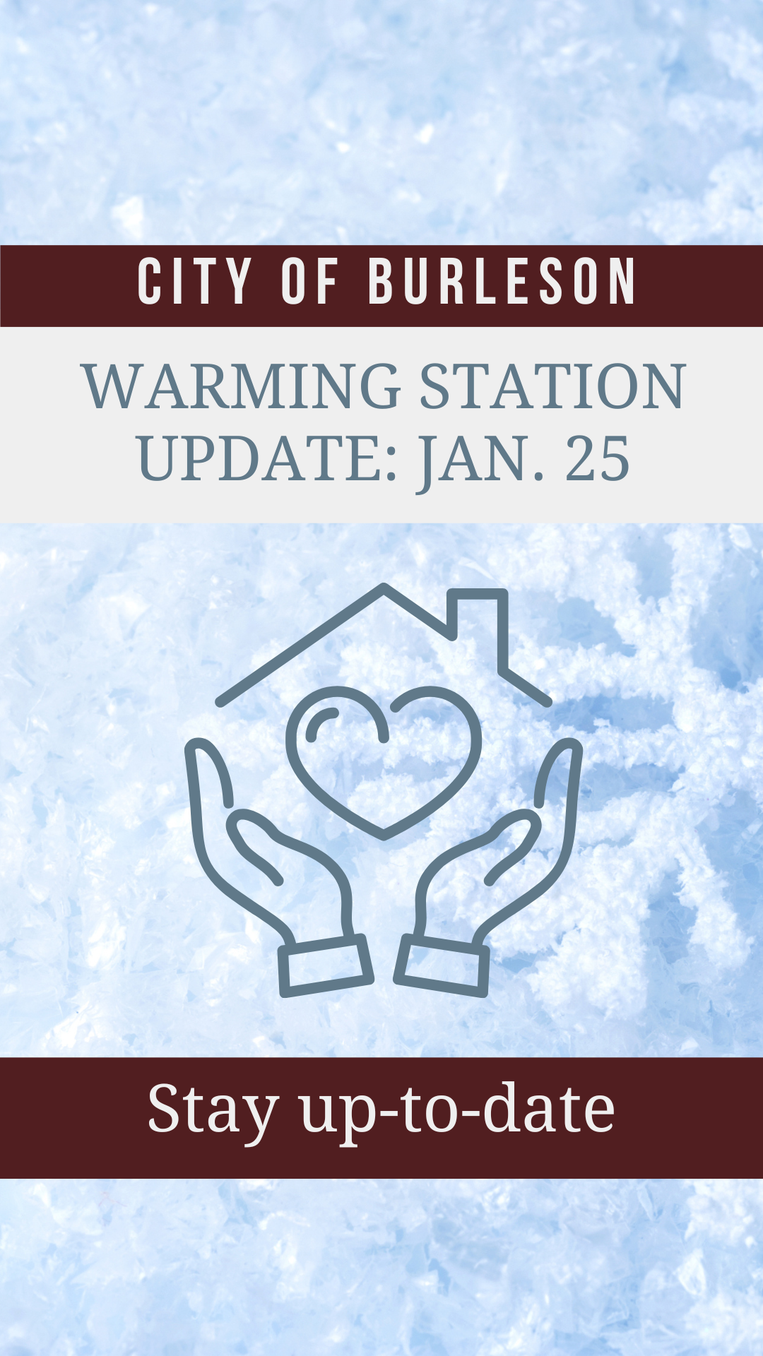 Due to approximately 200 homes currently without power and no confirmed restoration time, the City of Burleson will open a warming station at the Burleson Recreation Center (BRiCk), 550 NW Summercrest Blvd., beginning at 1:30 p.m. today, Sunday, Jan. 25.
